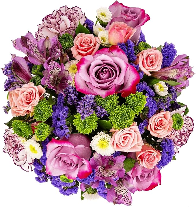 Purple and Pink Roses, Carnations, Statice, and Buttom Poms. (Vase Included)